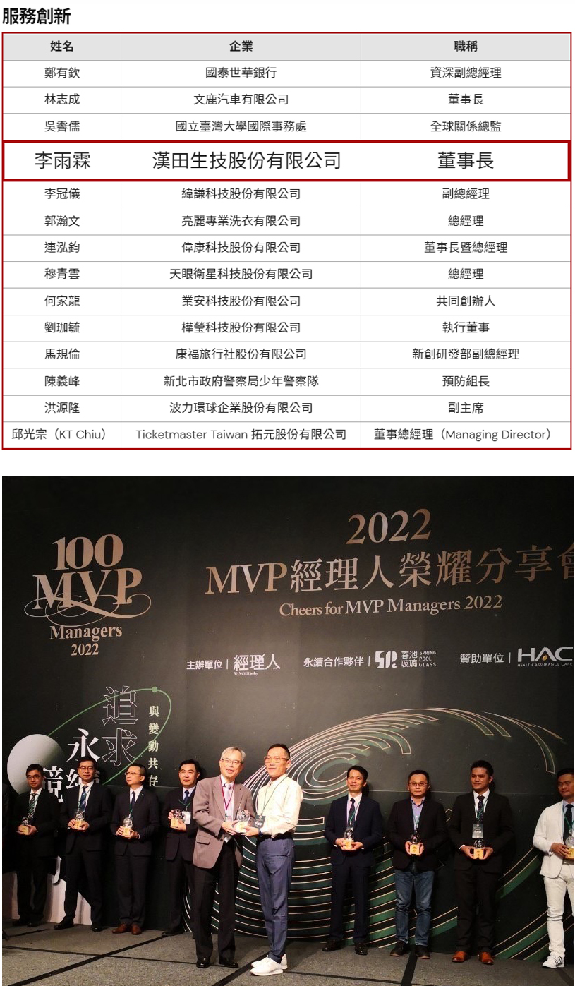 漢田生技董事長李雨霖受《經理人月刊》青睞提名,獲選服務創新類MVP。